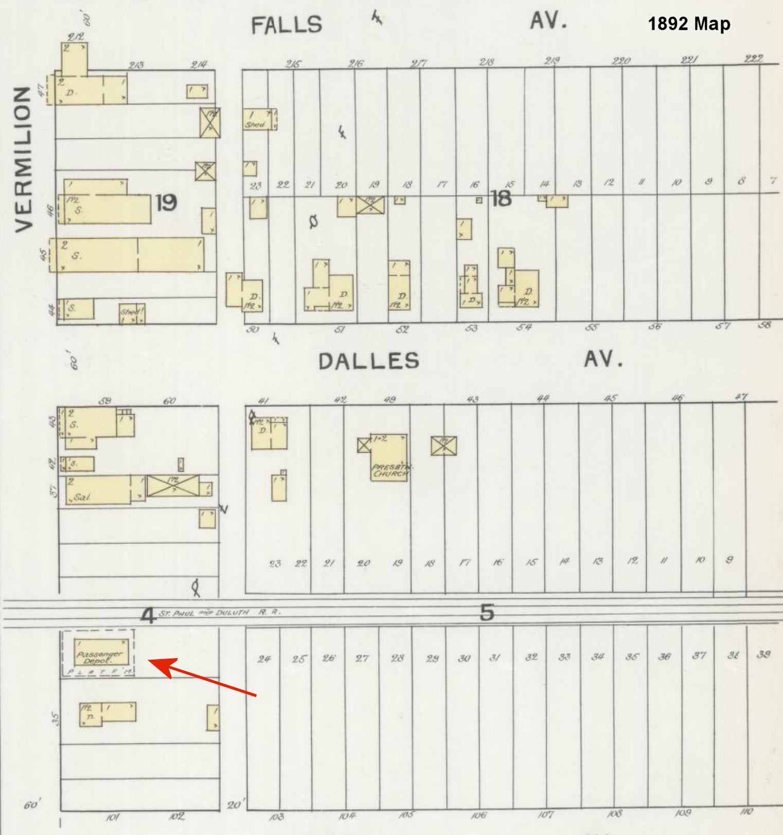 The original St. Paul & Duluth RR (later NP) passenger station was at the north end of Arch Street at approximately GPS: 46.723878, -92.464731. This two-story station appears on the 1885, 1888, and 1892 Sanborn maps. | ||||||