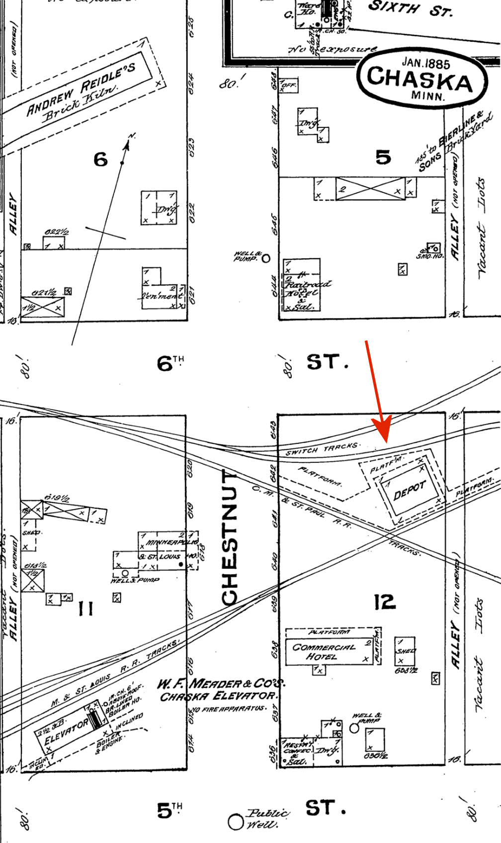 This depot was on 1st Street NW between Ash Avenue and Bluejay Avenue at approximately GPS: 44.884805, -93.889042. | ||||||