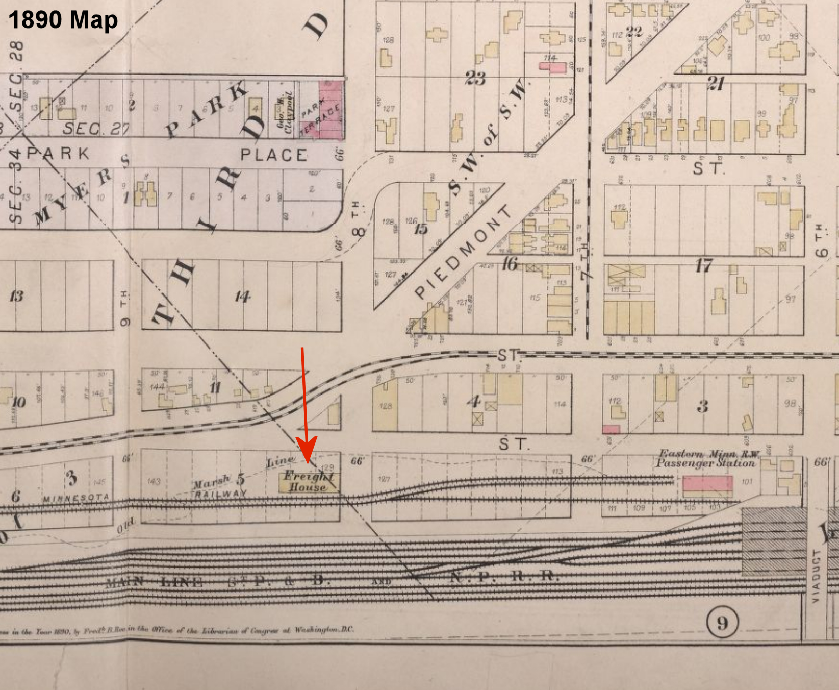 The freight house was at the SW corner of 4th Street North and North 6th Avenue West at GPS: 47.526783, -92.542384. This is now the location of Rotary Park. | ||||||