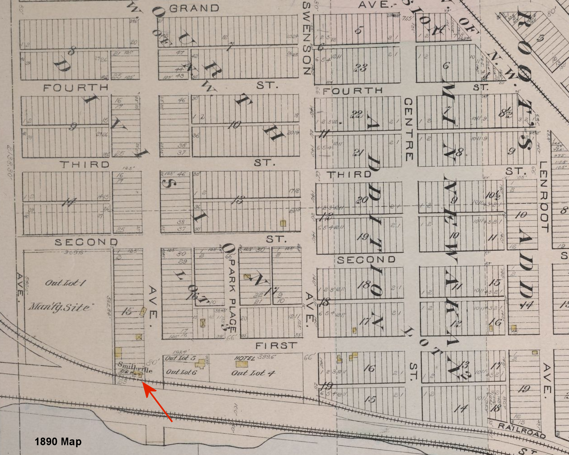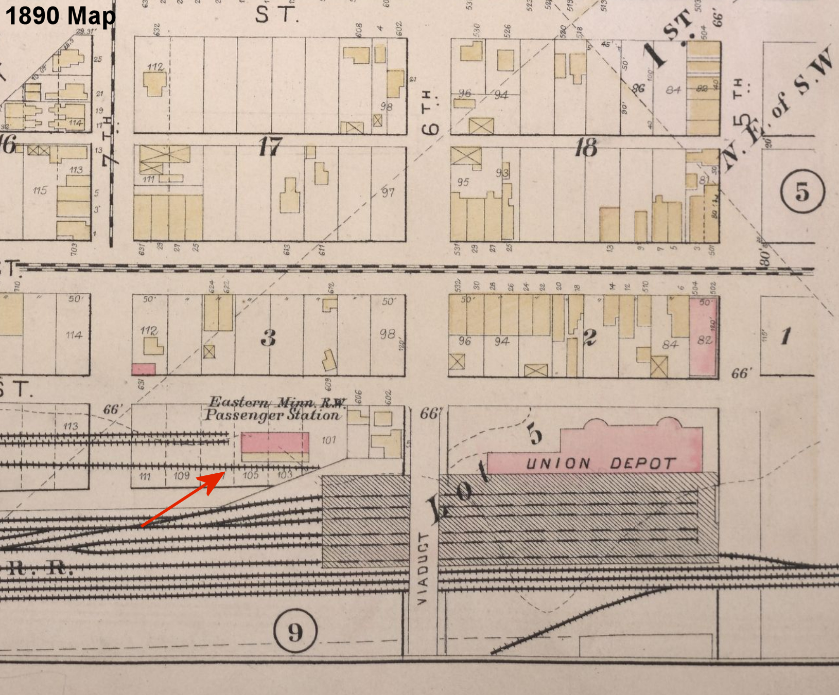 The passenger station was on the south side of Railraod Street (now 1st Avenue N.) just west of Mesaba Street (now 1st Street East) on the north side of the tracks at GPS: 47.528547, -92.235297. The freight station (added later) was on the east side of Jackson Street. | ||||||