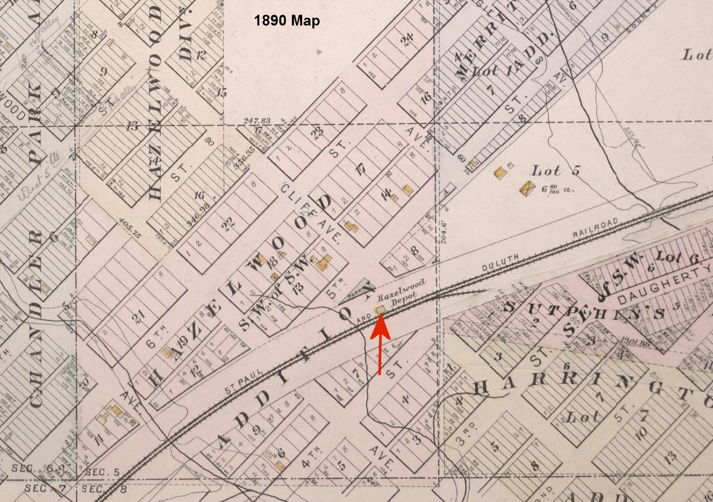 This station was on the northeast corner of Dorr and Main Streets. Prior to about 1910 there were two depots in town, the D&IR to the north (listed above) and DM&N to the south. When the neighboring mines grew, they swallowed up the D&IR ROW, so they rebuilt to the south sharing the DM&N ROW. By the mid teens the entire town of Sparta was swallowed up by the mines. | ||||||