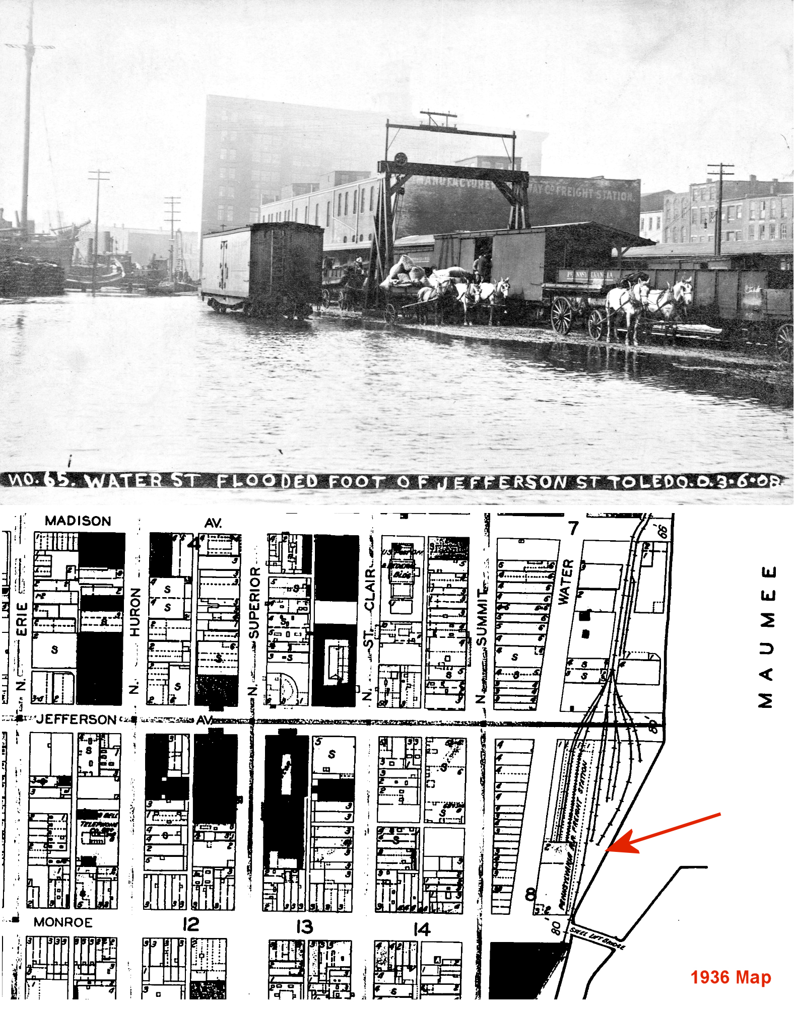 There was a freight station on the SE side of Water Street between Jefferson and Monroe Streets. The head end had frontage on Monroe Street (GPS: 41.648200, -83.535353). On early Sanborn maps, the building was labeled "Manufacturers Railroad Freight Depot." Later maps show it as a PRR freight station. | ||||||