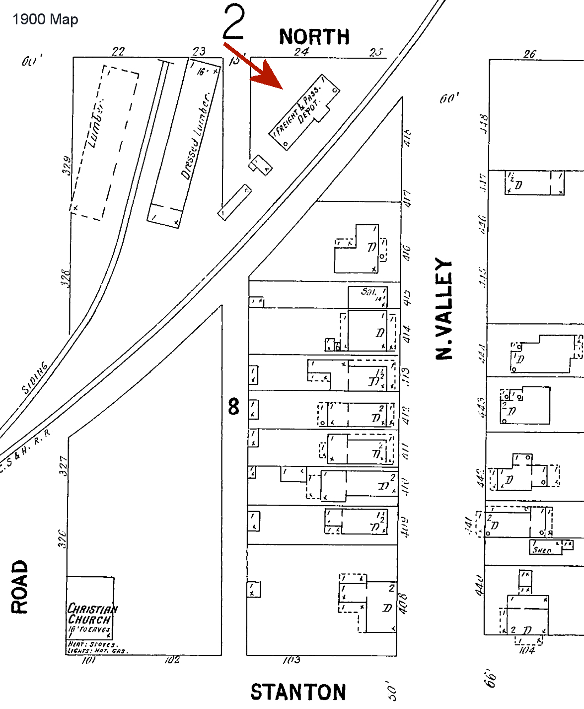 the leading theories: 1. The "freight station" was not marked correctly on the maps and was actually a combination station. 2. The building marked "passenger?" station above was the passenger station (and not marked correctly on maps) or the building was designed as one, but never used for that purpose. The branch line that ran north along Clark Street served nearby mines, so it could have been used as a station for local workers going to the mines. 3. The passenger station was in a part of town not covered by the old maps. -- Dan West |