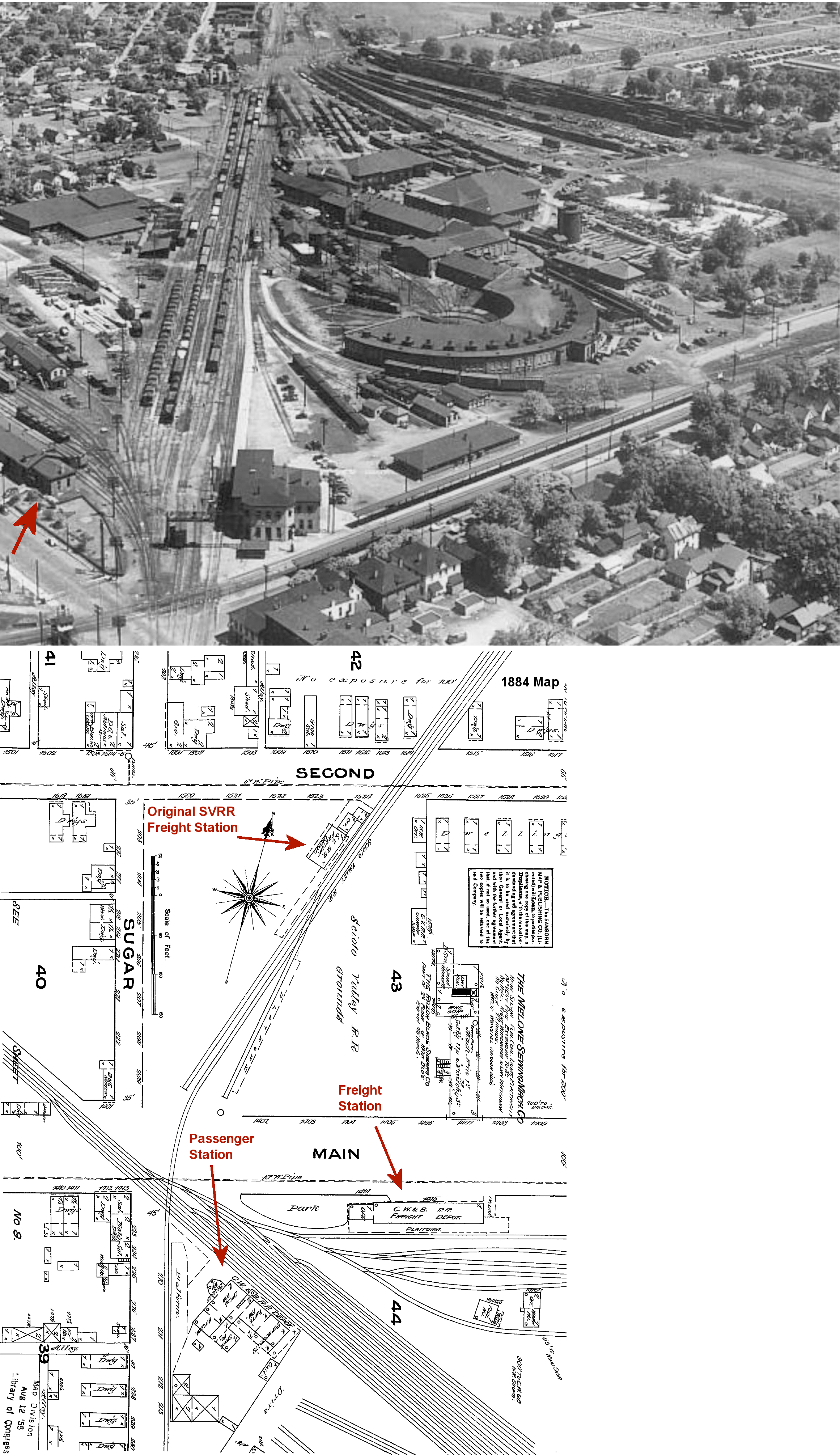 The M&C (CW&B, B&O) freight station was on the south side of Main Street across the tracks to the NE of the passenger station. It is shown on early maps and was demolished in 1960 to make way for the new Main Street overpass that was built that year. | ||||||