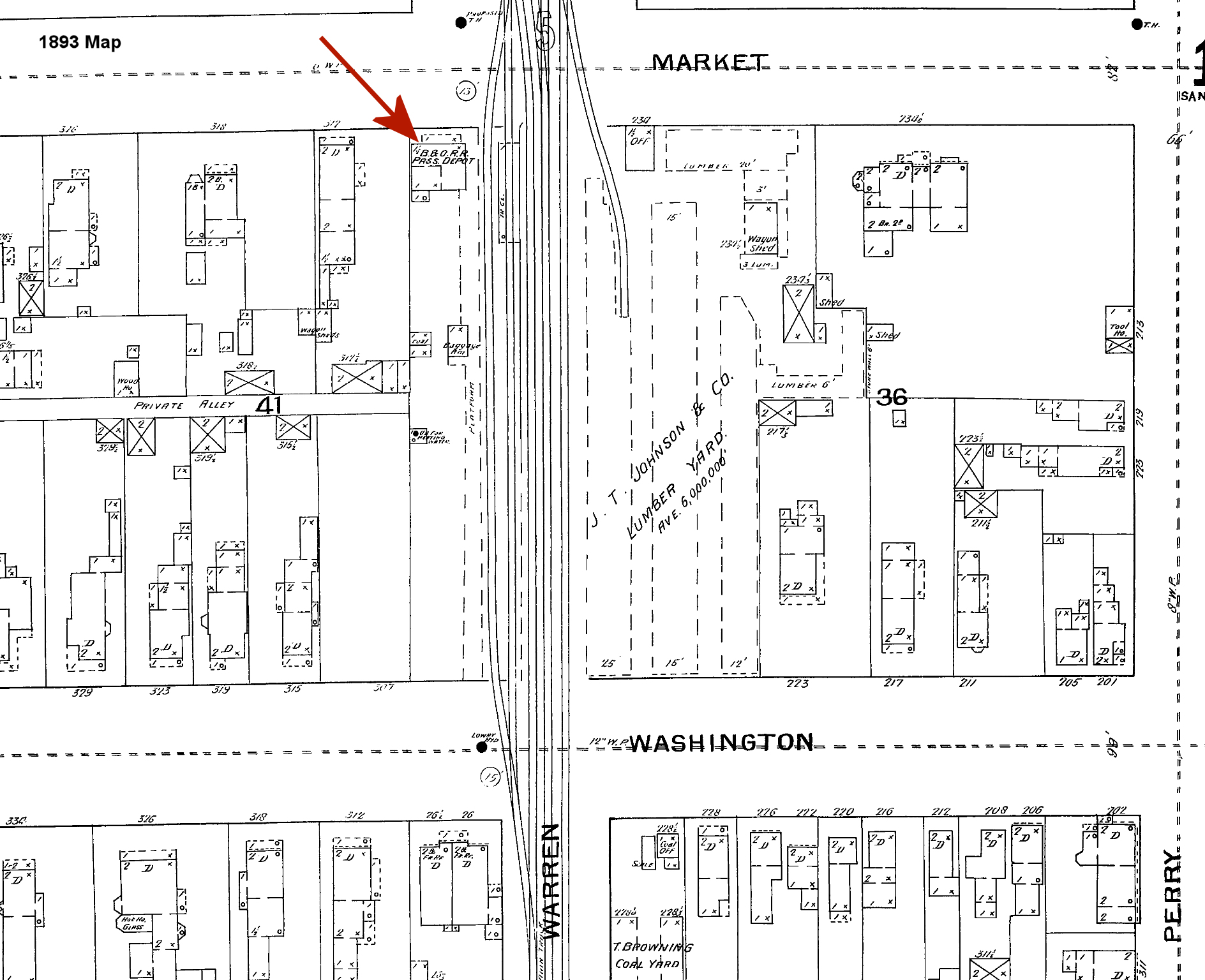 The original frame Sandusky, Mansfield & Newark station was on the SW corner of East Market and Warren Streets at GPS: 41.458073, -82.705507. It was likely built in the 1840s or 1850s. It may have also been a dwelling prior to becoming a depot (Sandusky Register, 12-20-1906). There was also a small baggage house nearby. At the time of its demise, the newspaper referred to it as one of the oldest in the state. | ||||||