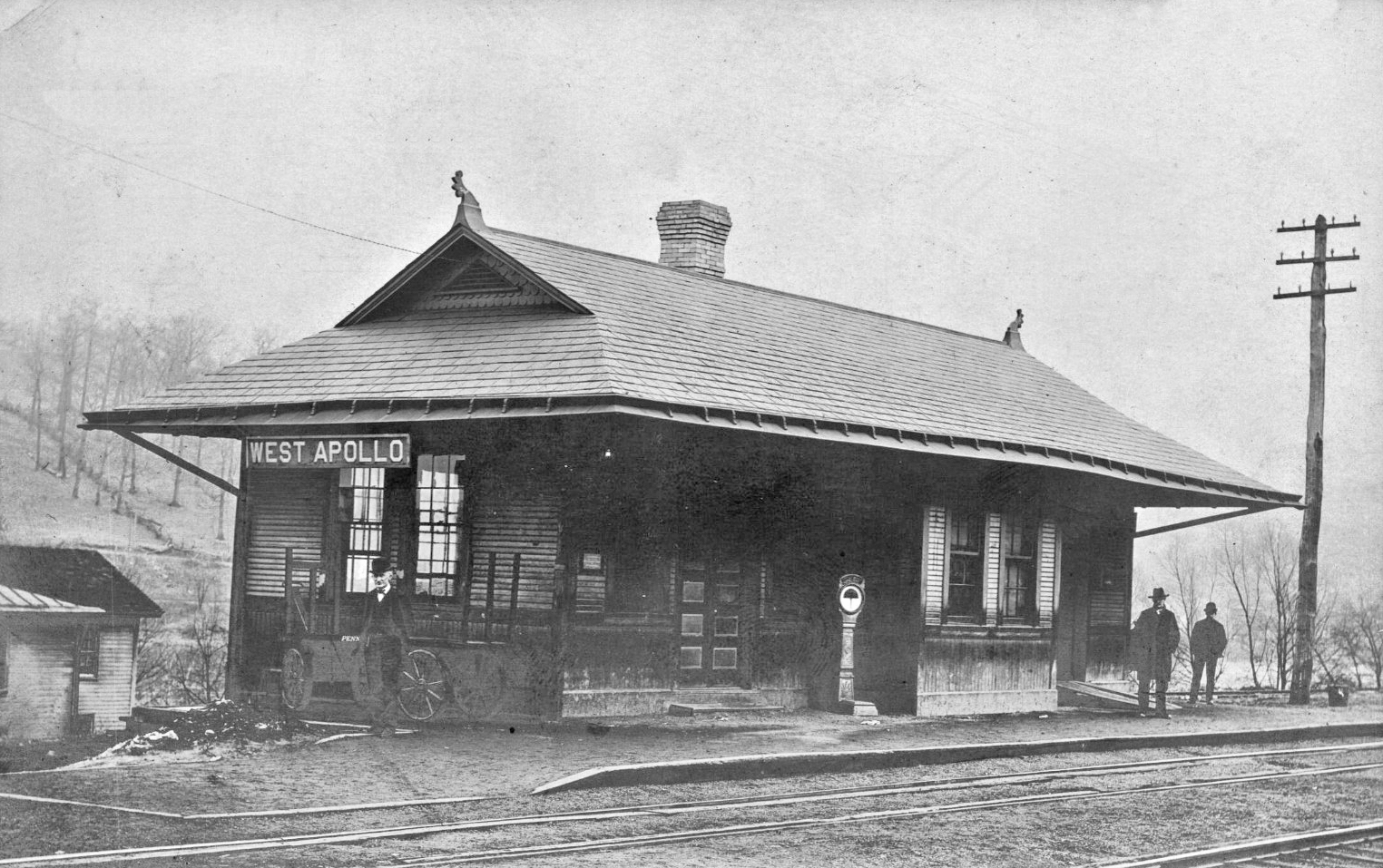 This brick combination passenger/freight station was on the north side of 1st Street on the east side of the tracks (GPS: 40.581617, -79.567427). In the late 1890s this station became a freight-only station with the station across the river in West Apollo (Westmoreland Co.) serving as the passenger station. For a short period, service was suspended to this station as the railroad bridge across the river on the north side of town fell into disrepair and the RR planned to abandon it (this bridge was located at GPS: 40.587400, -79.568605). A delegation from the town travelled to Philadelphia to meet with RR officials to plead their case to keep train service to Apollo. The RR agreed and a new bridge was constructed south of town (located at GPS: 40.571501, -79.564367) (see page 60 of the book "1816-1916; History of Apollo, Pennsylvania: The Year of a Hundred Years" by Thomas James Henry for a discussion of RR service to the town). In 1915 the station is once again listed on maps as a passenger/freight station. | ||||||